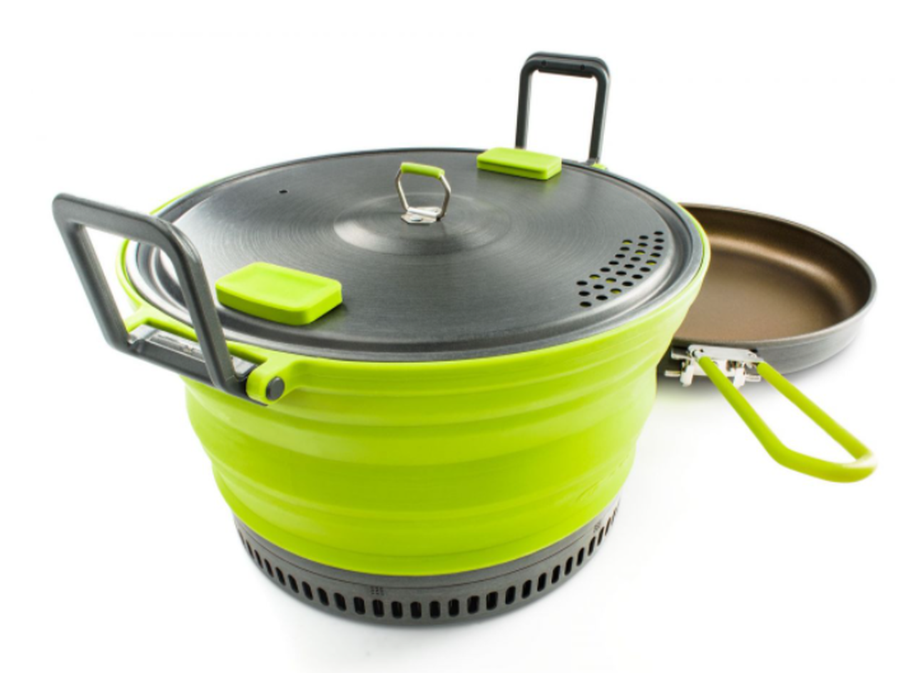 Cook more, carry less. The Escape HS pot combines a collapsible silicone body that takes up takes up 53% less space in your pack with our hyper-conductive anodized base that speeds cook times by up to 30% - that means you eat sooner and cut fuel use. The lid doubles as a strainer and has silicone pads at its grip points to help avoid burns. Graduations molded into the silicone pot body make measuring easy, dual handles make handling easy and fold out of the way for travel. The frypan has a non-stick coating that reduces mess and fuss, and an efficient even-heating design, and everything nests together in a compact storage bag.